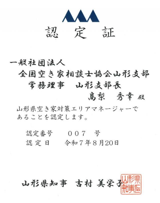 この度、山形県空き家対策エリアマネージャーに空き家相談士協会山形支部が認定されました。空き家相談士協会山形支部は空き家問題解決に向けて地域住民や行政と連携を図りながら、空き家相談のワンストップ窓口として精進してまいります。現に空き家問題を抱えている方、近くの空き家に悩まれている方、些細な事でも相談してもいいか悩まれている方、お気軽にお電話いただければと存じます、今後ともよろしくお願いいたします。